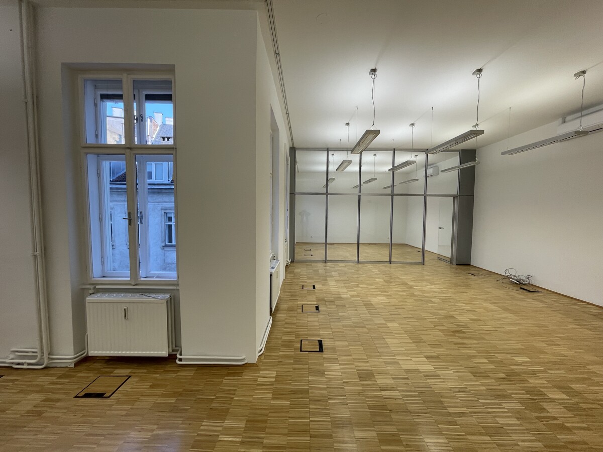 Der Zuschnitt der Fläche ist sehr offen gestaltet. Im goßen Arbeitsraum ist derzeit eine Teilfläche mit einer Glaswand abgetrennt.