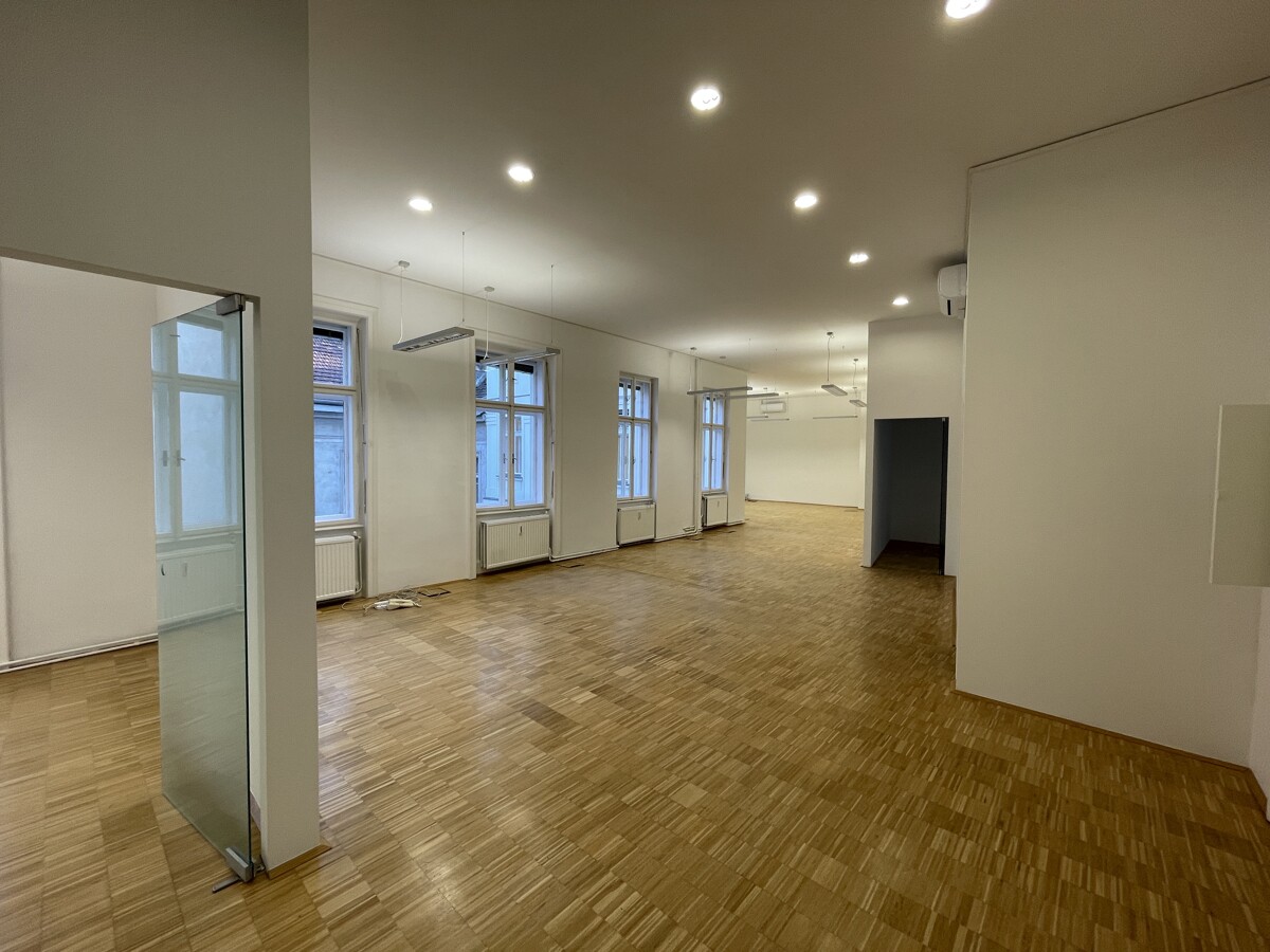 Darüber hinaus verfügt die Fläche über drei weitere Arbeitsräume (Geschäftsführung/Besprechung) sowie eine Teeküche und ein WC.