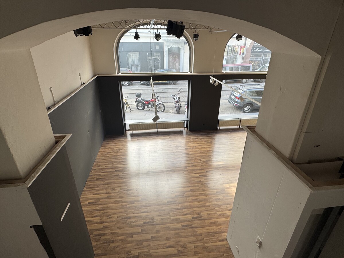 Die beiden Lokale verfügen über enorme Raumhöhen und große Portalfenster. Die Flächen werden